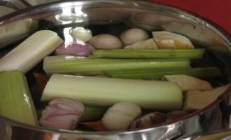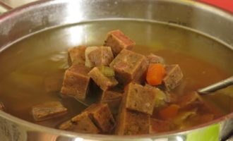 Готовим бульон: в 2,5 литра воды отвариваем овощи с щепоткой соли. Похлебку можно готовить и на мясном бульоне, такой вариант более распространен.