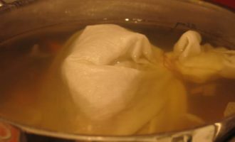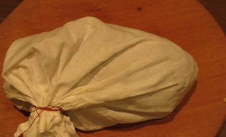 Помещаем колобок в мешок, завязываем так, чтобы оставалось пространство между тестом и тканью. Мешочек для похлебки не должен стираться с мылом или другими моющими, чтобы не изменился вкус блюда.