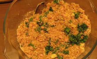 Кладем в массу ветчину и зелень петрушки, специи, масло.