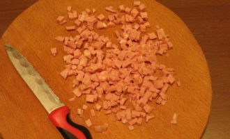 Нарезаем ветчину. Количество мясного можно увеличить для питательности блюда.