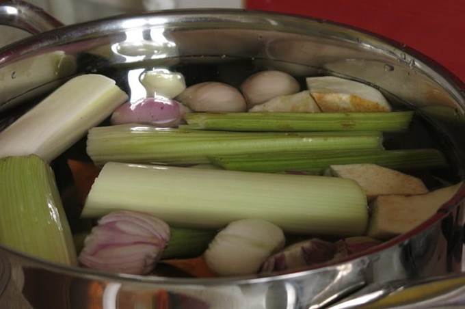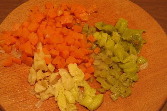 Готовим бульон: в 2,5 литра воды отвариваем овощи с щепоткой соли. Похлебку можно готовить и на мясном бульоне, такой вариант более распространен.