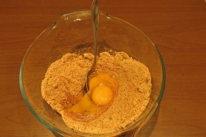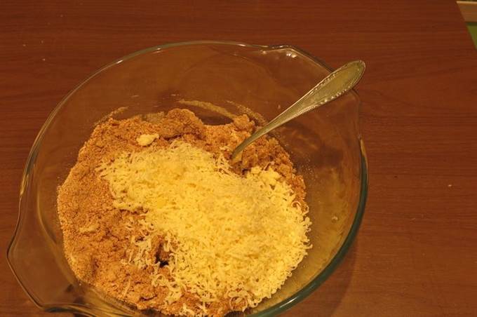 Готовим колобок: сухари, яйца, ветчина, сыр, соль, перец, мускатный орех и масло растительное. В сухари наливаем немного бульона, у меня пошло 140 мл.