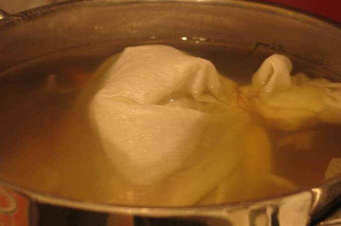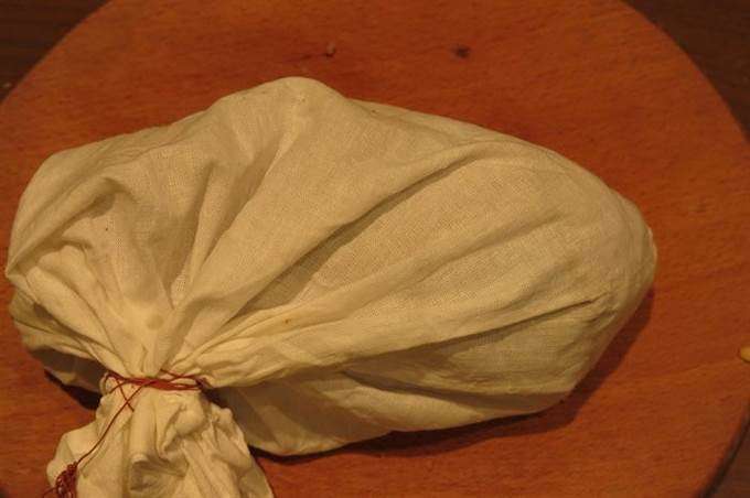 Помещаем колобок в мешок, завязываем так, чтобы оставалось пространство между тестом и тканью. Мешочек для похлебки не должен стираться с мылом или другими моющими, чтобы не изменился вкус блюда.