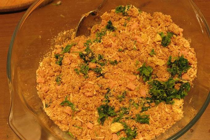Кладем в массу ветчину и зелень петрушки, специи, масло.