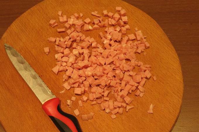 Нарезаем ветчину. Количество мясного можно увеличить для питательности блюда.