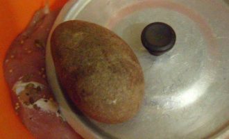 Положить мясо в сито или дуршлаг, сверху накрыть крышкой и положить что-нибудь тяжелое (у меня есть специальный камень). Так мясо пустит сок и будет течь. Сутки спустя тщательно ножом удалить с мяса остатки смеси.