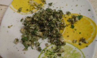 Приготовить смесь для натирания. Чеснок почистить и натереть на мелкой терке (не давить!), добавить зелень укропа и петрушки, сахар, хрен. Натереть мясо готовой смесью и завернуть в пергаментную бумагу. Оставить на сутки при комнатной температуре.