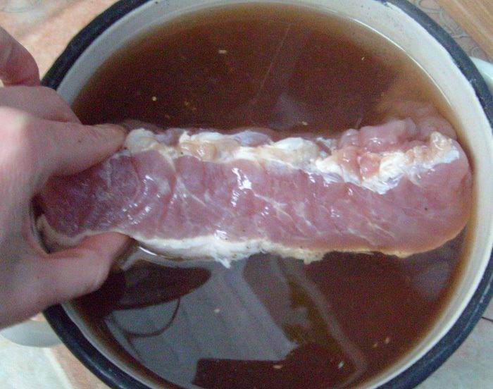 Залить этим рассолом мясо и убрать в холодное проветриваемое место на 1-2 дня (например, на балкон). Выдержанное мясо вынуть из рассола и обсушить салфеткой.