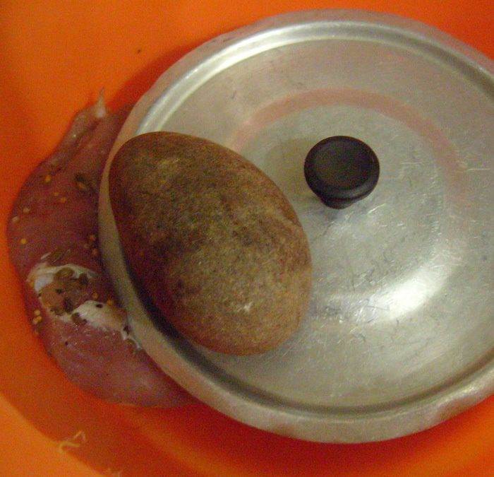 Положить мясо в сито или дуршлаг, сверху накрыть крышкой и положить что-нибудь тяжелое (у меня есть специальный камень). Так мясо пустит сок и будет течь. Сутки спустя тщательно ножом удалить с мяса остатки смеси.