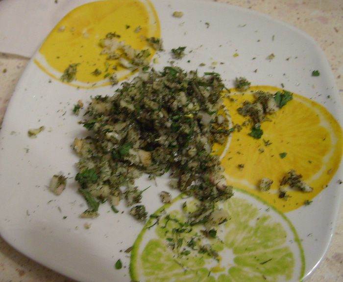 Приготовить смесь для натирания. Чеснок почистить и натереть на мелкой терке (не давить!), добавить зелень укропа и петрушки, сахар, хрен. Натереть мясо готовой смесью и завернуть в пергаментную бумагу. Оставить на сутки при комнатной температуре.