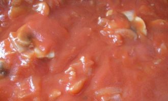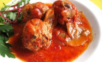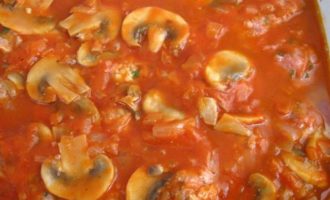 Приготовить соус. Обжарить лук до прозрачности на сковороде с добавлением оливкового масла, добавить чеснок, пропущенный через пресс, налить вино, несколько минут потушить, затем положить грибы, посолить, поперчить и через 1-2 минуты добавить пассированные томаты и томатную пасту. Мясным (овощным) бульоном отрегулировать консистенцию, подержать на небольшом огне, помешивая, несколько минут. Соуса должно быть много, чтобы он покрывал мясные шарики полностью.