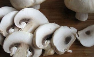Лук почистить, порезать кубиками, грибы — пластинами. Шампиньоны можно заменить лисичками.