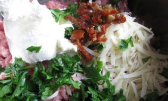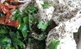 Измельченную петрушку, мелко нарезанные вяленые томаты.