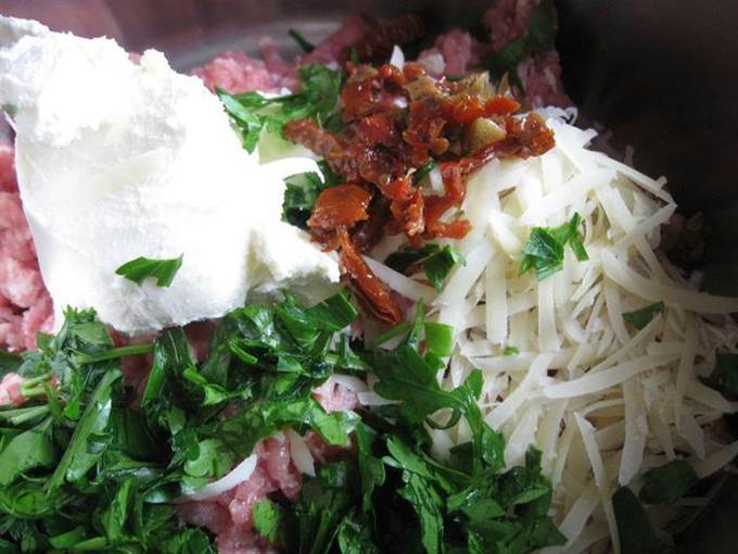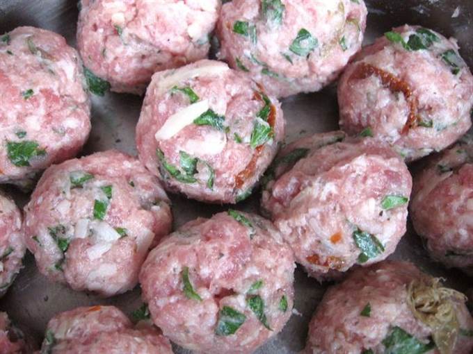 Руки сполоснуть в холодной воде, чтобы фарш не лип к ним. Скатать мясные шарики. Положить в форму, смазанную оливковым маслом.