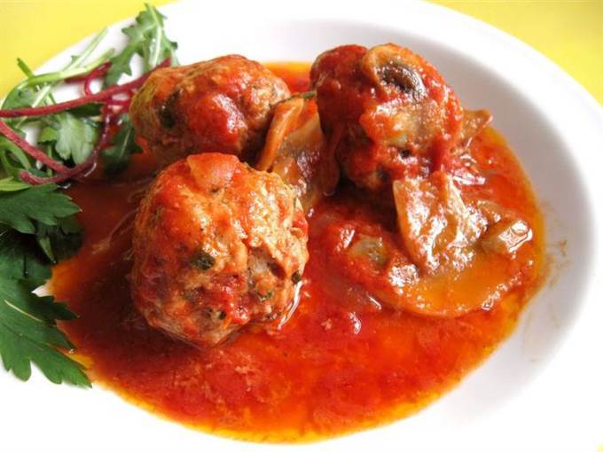 Приготовить соус. Обжарить лук до прозрачности на сковороде с добавлением оливкового масла, добавить чеснок, пропущенный через пресс, налить вино, несколько минут потушить, затем положить грибы, посолить, поперчить и через 1-2 минуты добавить пассированные томаты и томатную пасту. Мясным (овощным) бульоном отрегулировать консистенцию, подержать на небольшом огне, помешивая, несколько минут. Соуса должно быть много, чтобы он покрывал мясные шарики полностью.