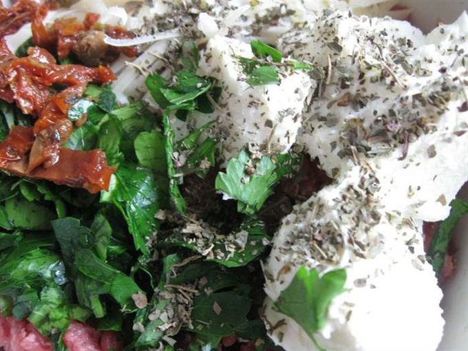 Измельченную петрушку, мелко нарезанные вяленые томаты.
