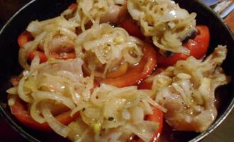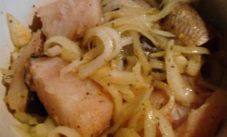 • Уложите филейки и посыпьте луком, полейте маслом.