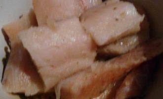 • Нарезать филе на 8 одинаковых кусков, посолить.