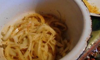 • Лук полукольцами помять с пряностями по вкусу и сбрызнуть лимонным соком.