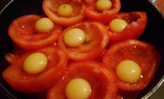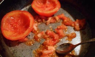 • 4 помидора разрежьте пополам и удалите мякоть ложечкой, установите 8 чашечек на выровненную мякоть.