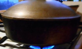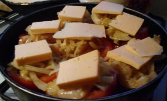 • Накройте 8-ю кусочками сыра и поставьте запекаться, лучше в духовку. Я, чтобы получилось быстрее, разогрел сотейник и поставил на маленький огонь на плиту, но так сыр полностью не расплавится.