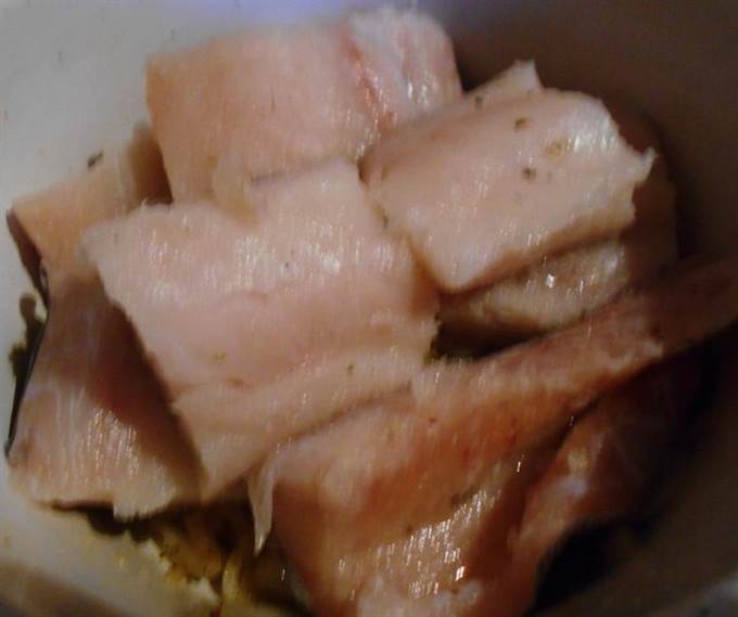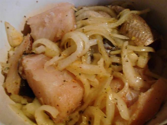 • Уложите филейки и посыпьте луком, полейте маслом.