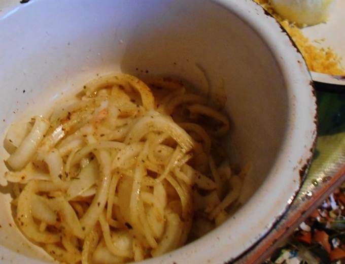 • Лук полукольцами помять с пряностями по вкусу и сбрызнуть лимонным соком.