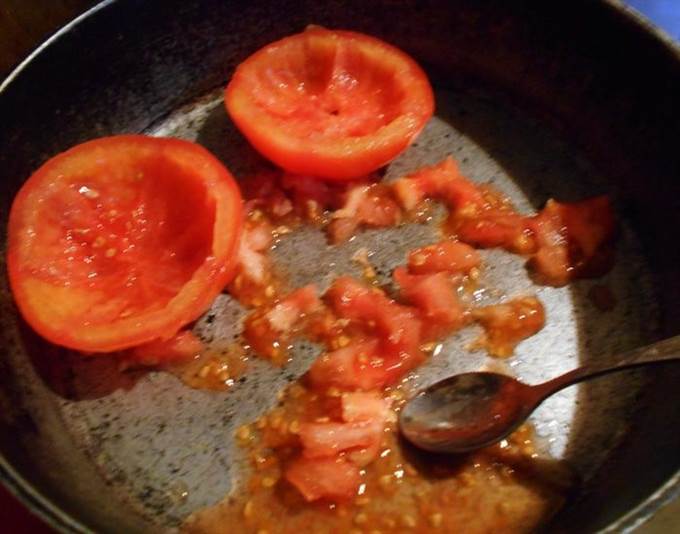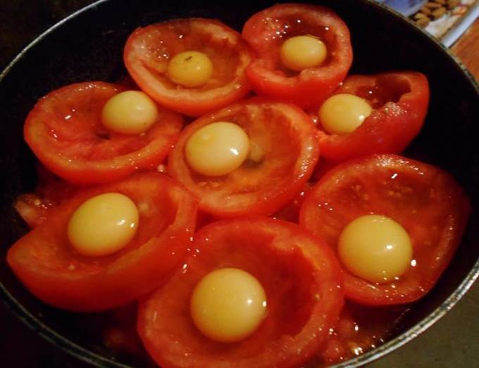 • 4 помидора разрежьте пополам и удалите мякоть ложечкой, установите 8 чашечек на выровненную мякоть.
