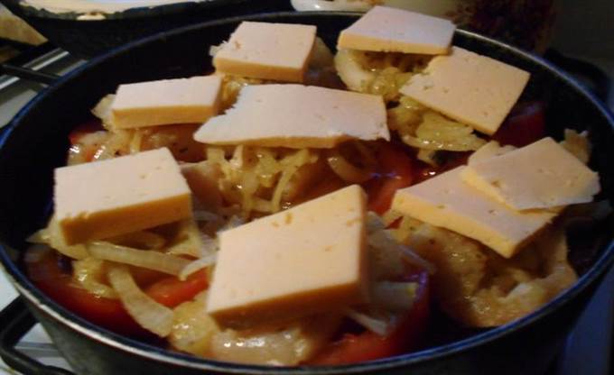 • Накройте 8-ю кусочками сыра и поставьте запекаться, лучше в духовку. Я, чтобы получилось быстрее, разогрел сотейник и поставил на маленький огонь на плиту, но так сыр полностью не расплавится.