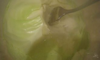 • Капусту проварить традиционно в подсоленной воде с добавлением уксуса 4 минуты. Кочерыжку вырежьте, разберите кочан на листья. У каждого листочка срезаем утолщение.