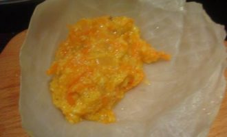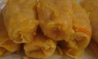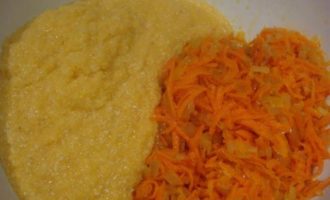 • Кукурузную крупу залейте кипятком, и сварите до готовности на слабом огне (для голубцов лучше брать кукурузную крупу грубого помола). Морковь натрите на крупной терке, лук нарежьте мелкими кубиками. Разогрейте масло в сковороде, поджарьте на нем до золотистости лук и морковь. тушеные овощи переложите в глубокую миску и соедините с кукурузной крупой. Перемешайте, посолите, поперчите и добавьте немного мускатного ореха.