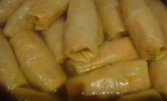 • Готовые голубцы складываем в кастрюлю. Заливаем горячей водичкой на 1 сантиметр выше от уровня голубцов. Тушить в духовке около 1 часа с момента закипания, до готовности.