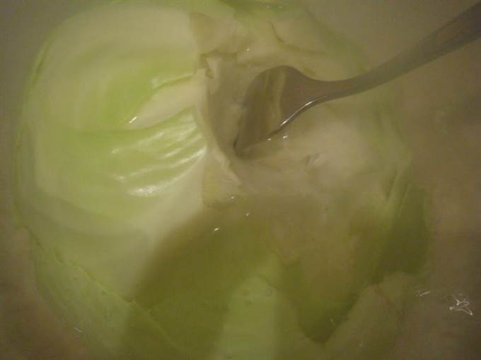 • Капусту проварить традиционно в подсоленной воде с добавлением уксуса 4 минуты. Кочерыжку вырежьте, разберите кочан на листья. У каждого листочка срезаем утолщение.