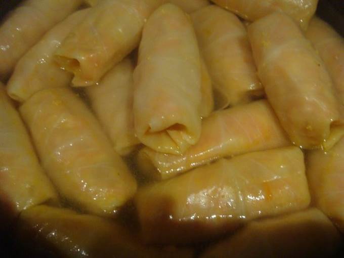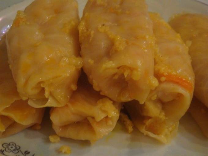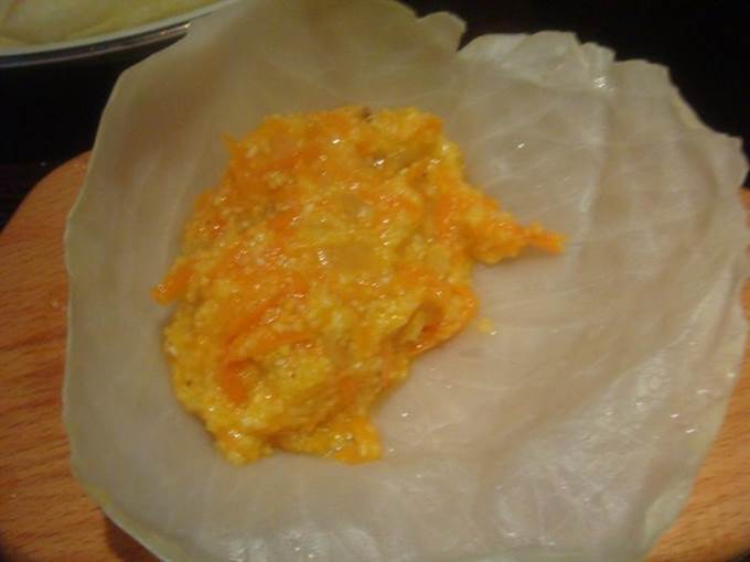 • Кукурузную крупу залейте кипятком, и сварите до готовности на слабом огне (для голубцов лучше брать кукурузную крупу грубого помола). Морковь натрите на крупной терке, лук нарежьте мелкими кубиками. Разогрейте масло в сковороде, поджарьте на нем до золотистости лук и морковь. тушеные овощи переложите в глубокую миску и соедините с кукурузной крупой. Перемешайте, посолите, поперчите и добавьте немного мускатного ореха.