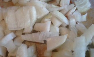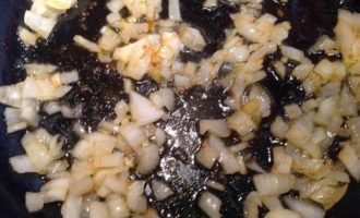 На сковороду добавьте растительное масло и обжарьте лук др золотистости.