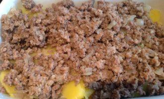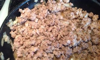 Добавьте фарш, слегка посолите и жарьте помешивая, 5-7 минут.