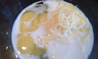 Смешайте яйца, молоко и натертый сыр, немного посолите и поперчите.