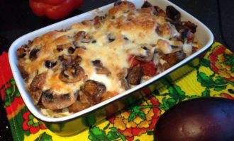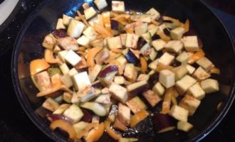 Баклажаны нарежьте кубиками, болгарский перец тонкими полосками. Обжаривайте на той же сковороде 5-7 минут, пока баклажаны не подрумянятся.