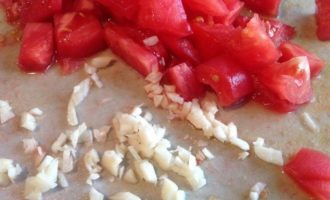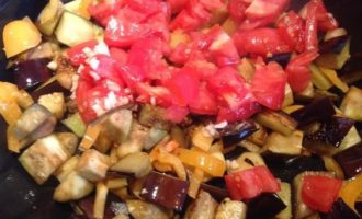 Помидор и чеснок добавьте к баклажанам. Посолите, поперчите, сделайте огонь тише и тушите под крышкой 5 минут. Выложите.