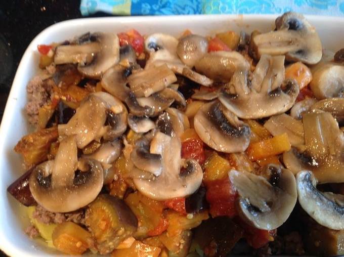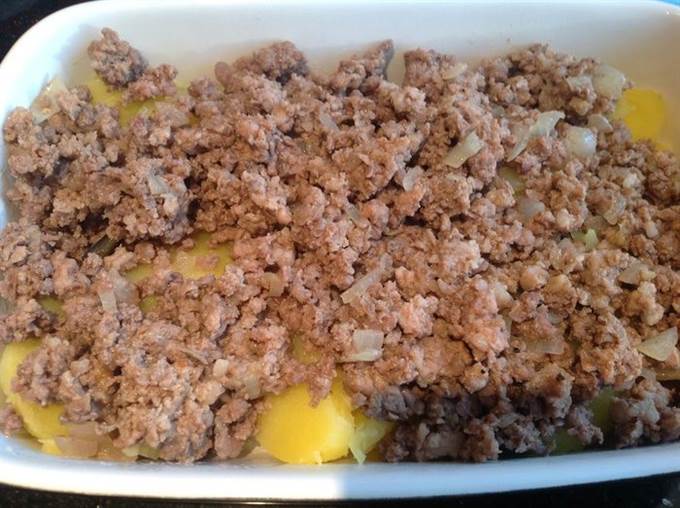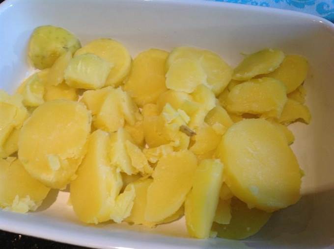 В смазанную маслом форму выложите нарезанный кружочками картофель…
