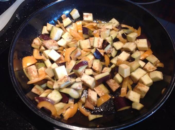 Баклажаны нарежьте кубиками, болгарский перец тонкими полосками. Обжаривайте на той же сковороде 5-7 минут, пока баклажаны не подрумянятся.