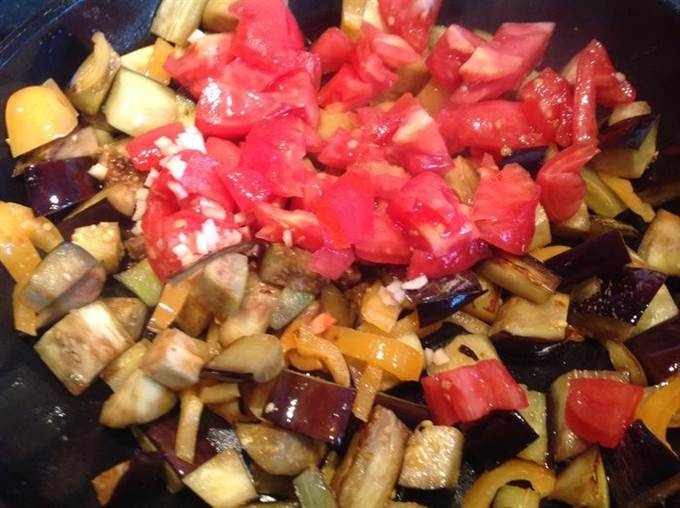 Помидор и чеснок добавьте к баклажанам. Посолите, поперчите, сделайте огонь тише и тушите под крышкой 5 минут. Выложите.