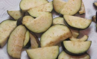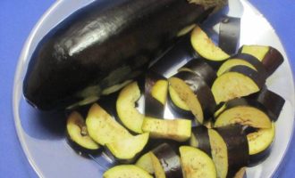 • Баклажаны вымыть и обсушить. Затем разрезать пополам и нарезать ломтиками.