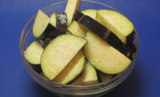 • Посыпать баклажаны солью, перемешать и оставить на 30 минут.