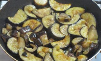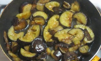 • Подготовленные баклажаны выложить в сотейник или сковороду с разогретым растительным маслом и жарить, помешивая, в течение 10-12 минут.