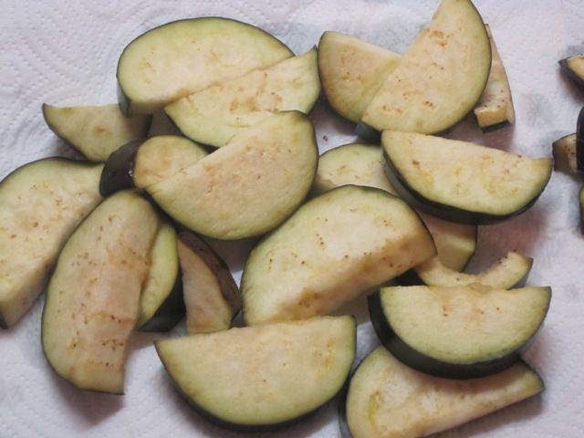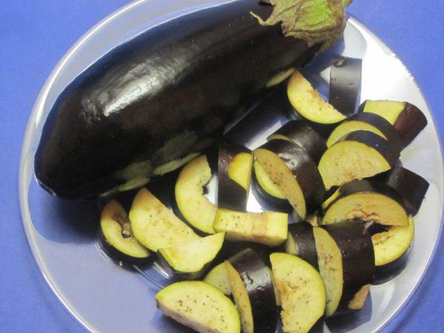 • Баклажаны вымыть и обсушить. Затем разрезать пополам и нарезать ломтиками.
