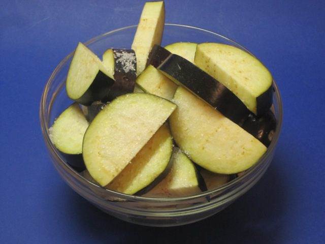 • Посыпать баклажаны солью, перемешать и оставить на 30 минут.
