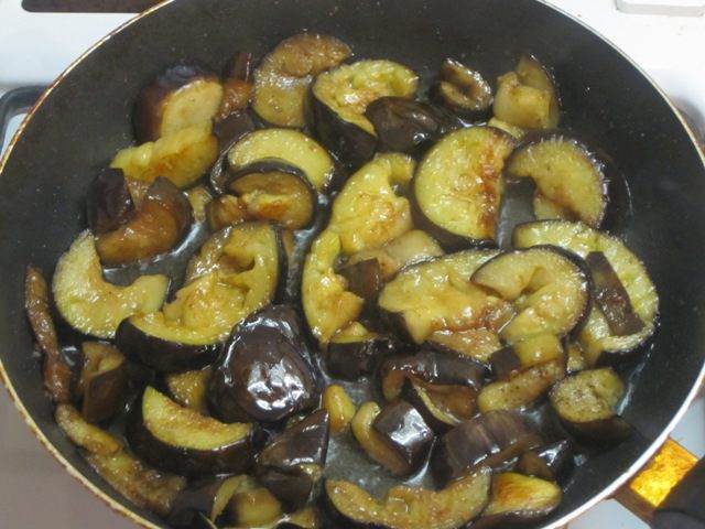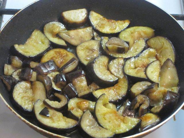 • Подготовленные баклажаны выложить в сотейник или сковороду с разогретым растительным маслом и жарить, помешивая, в течение 10-12 минут.