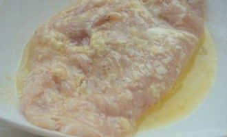 • Пока тесто стоит займемся начинкой: куриное филе помыть, отбить. Посолить, поперчить и сдобрить специями по вкусу.