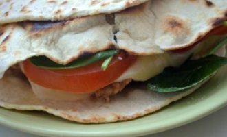 • В горячую лепешку кладем горячее филе, сверху 2 кружка моцареллы, затем помидоры и посыпаем молодым шпинатом, накрываем второй половиной и подаем.